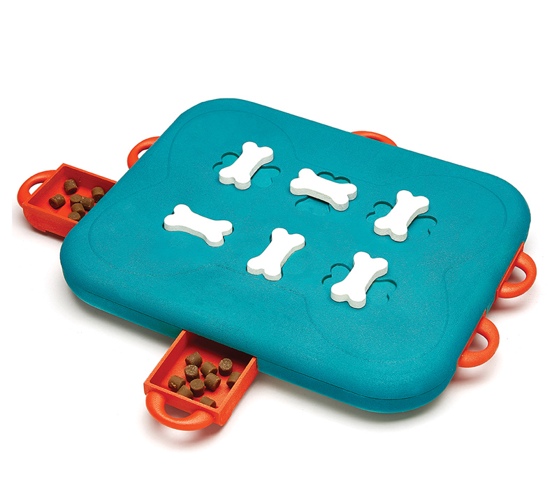 Megoldandó feladatok: 3 szintes pörgő tálcák forgatása, hogy a jutalomfalatok elérhetővé válljanak. A csont formák behelyezésével nehezíthető a feladat.